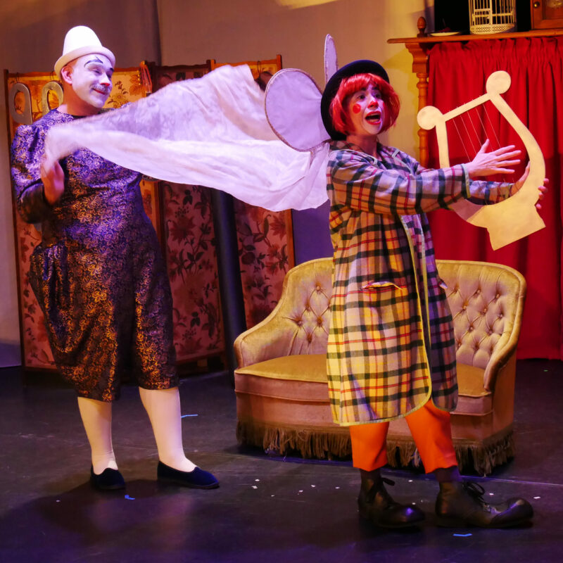 Accompagnés à la trompette par les airs de Nino Rota, de Claude Debussy ou Camille Saint-Saëns, les comédiens-clowns font jeu de tout bois.
